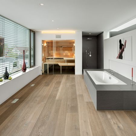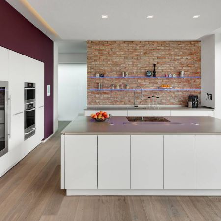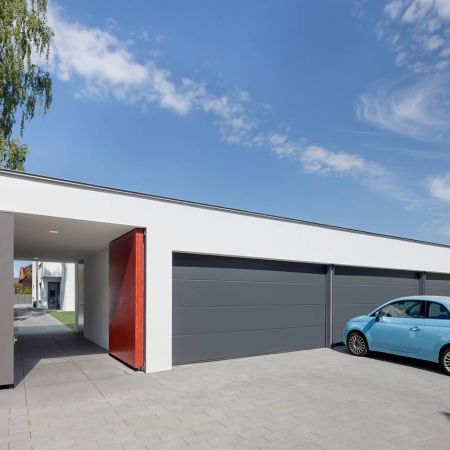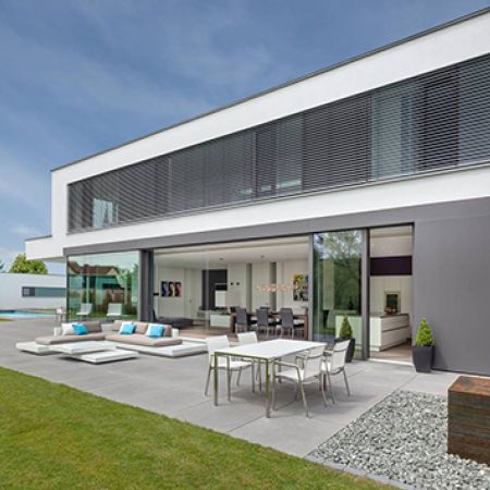 Ein harmonisches Ganzes mit Architektur und Innenarchitektur aus einer Hand. Der Garagenriegel mit dem markant roten Portal schützt zur Straße die private Atmosphäre. Energetisch setzt das Haus voll auf regenerativ, u.a. mit Erdwärmepumpe.